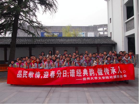 3月17日下午,文学院的学生们来到了扬州市维扬实验小学四年级6班,教小朋友们学唱扬州民歌、自绘纸鸢。