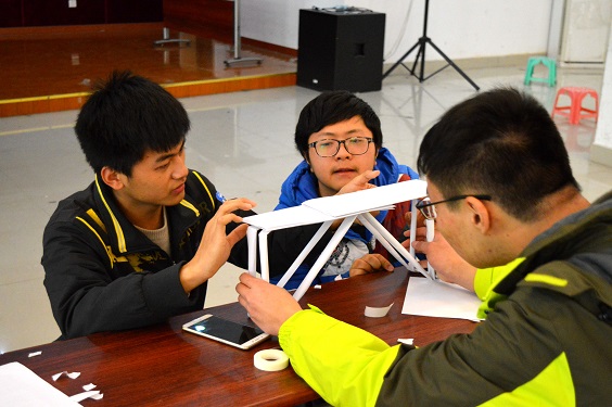 比赛共分三个阶段,第一阶段由参赛选手现场进行模型制作;第二阶段为选手们对自己的作品进行说明讲解;第三阶段是现场评选出最佳作品。比赛开始后,选手们根据设计好的图纸,利用事先准备好的废纸、废塑料瓶、废木板等材料,争分夺秒地展开制作。他们用行动充分证明,世界上没有垃圾,只有放错地方的东西。制作结束后,选手们结合所学的力学原理知识,对自己的设计理念进行了详细解说。