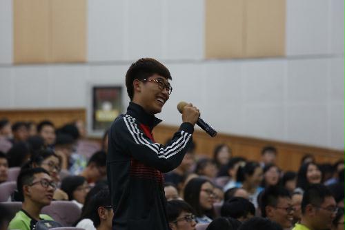 近两个半小时的精彩演讲在互动、思辨与欢笑掌声中收尾。在访谈互动环节中,学生们踊跃向骆老师提问。骆新就青年最关心、最困惑的话题作了认真而精妙的回答。随后,我校 “创益家”公益创业团队代表将精心刻制的橡皮图章赠给骆老师,并与骆老师合影留念。