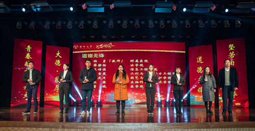 颁奖典礼分为“大德•敦厚”“大智•睿达”“大气•磅礴”三大篇章,邀请了校党委原副书记、关工委副主任梁隆圣、水利与能动学院教授陆林广、新传学院教授邓杰分别为三个篇章作开篇朗读。通过VCR展示、音诗画、歌曲表演、访谈等多种形式,展示了我校师生在孝老爱亲、学术科技、志愿实践、自立自强、文体艺术等方面向上向善、催人奋进的感人事迹,充分展现了新时代扬大师生的青春风采。典礼现场还推出了微电影《生命中最重要的人》,通过一个个感人至深的镜头表达了感恩亲情的主题。